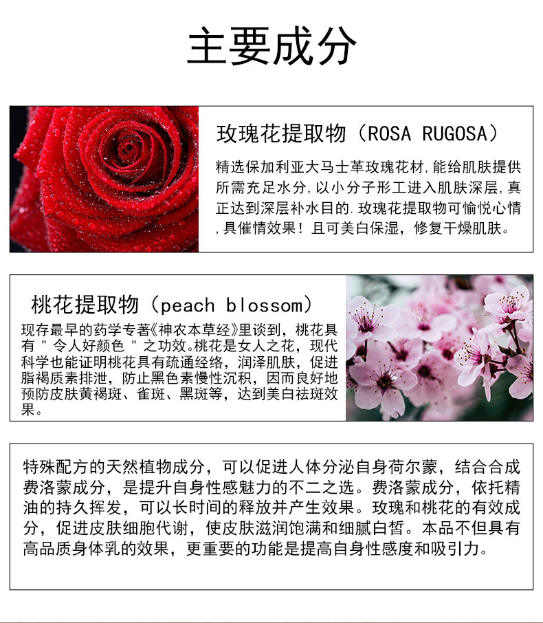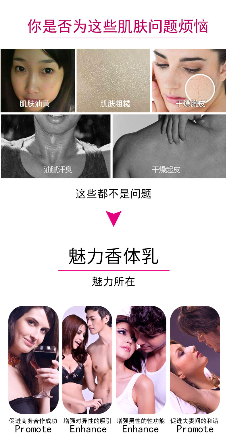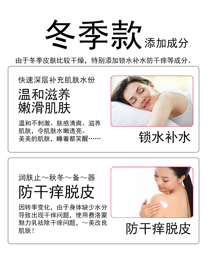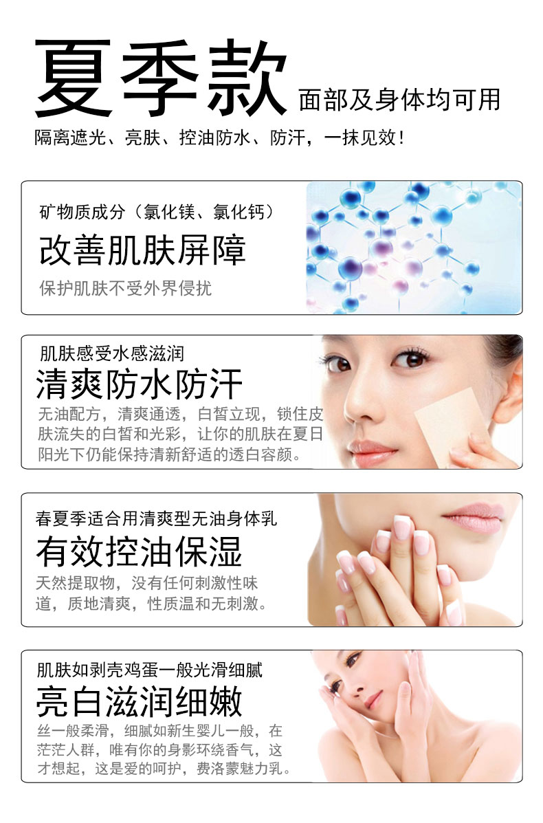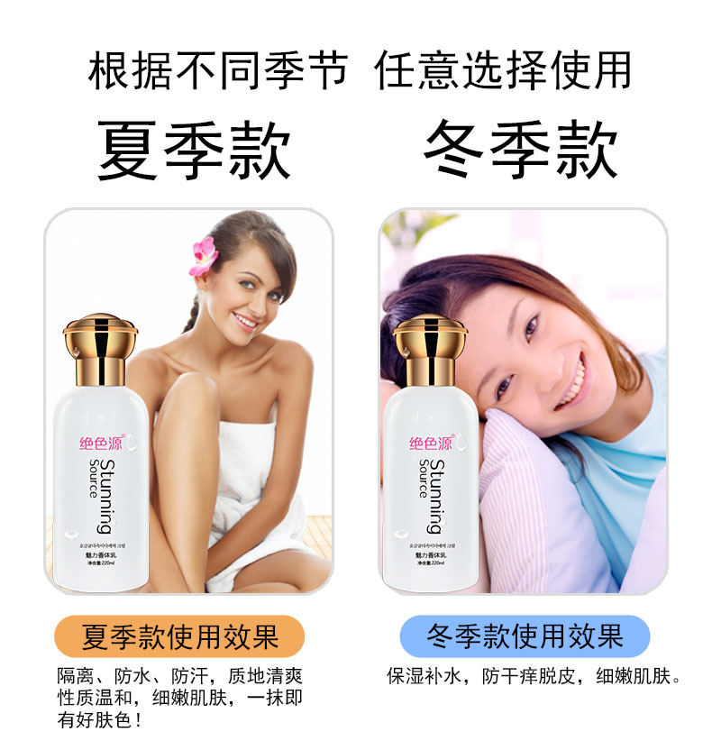 產(chǎn)品功效:質(zhì)地清爽,配方溫和,夏季使用保濕補水,細嫩肌膚,改善油膩肌膚,冬季使用持久滋潤,舒緩干燥肌膚,使肌膚柔潤細膩,蘊含植物精萃提取物,持久留香,煥發(fā)迷人魅力。