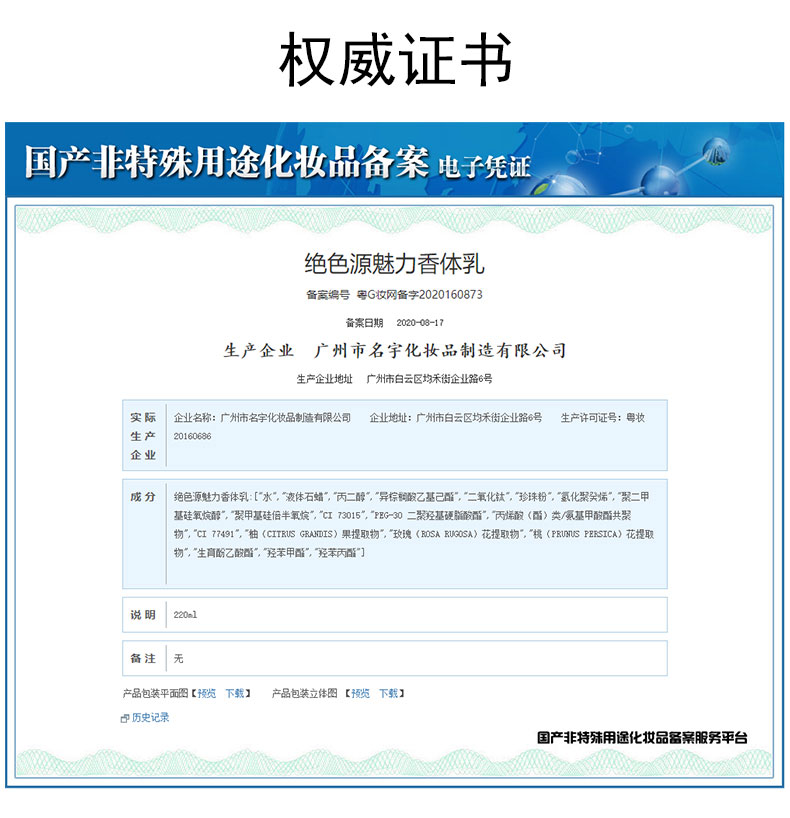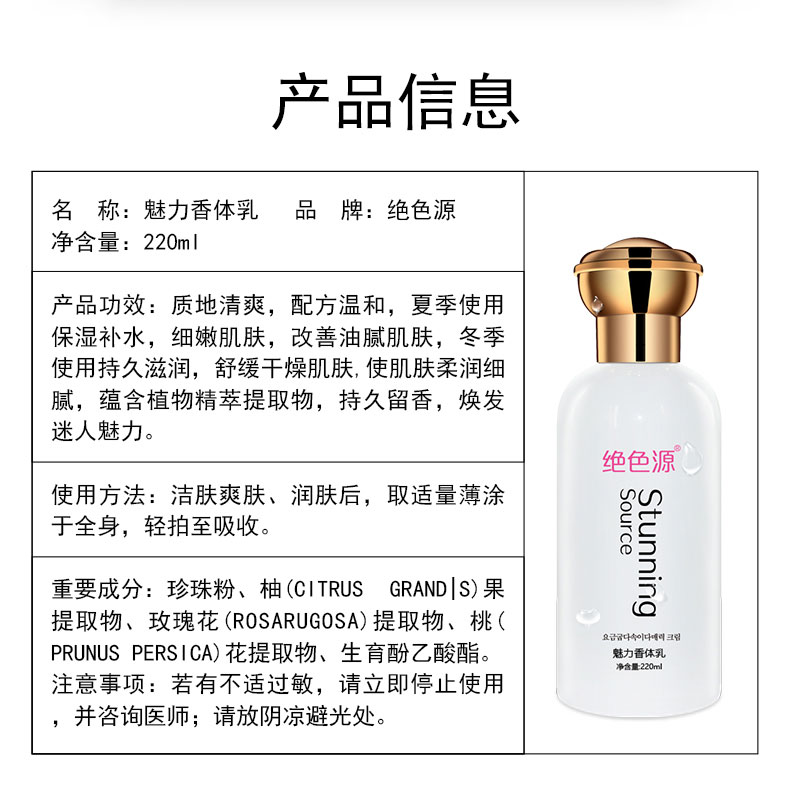 使用方法:潔膚爽膚、潤膚后,取適量薄涂于全身,輕拍至吸收。